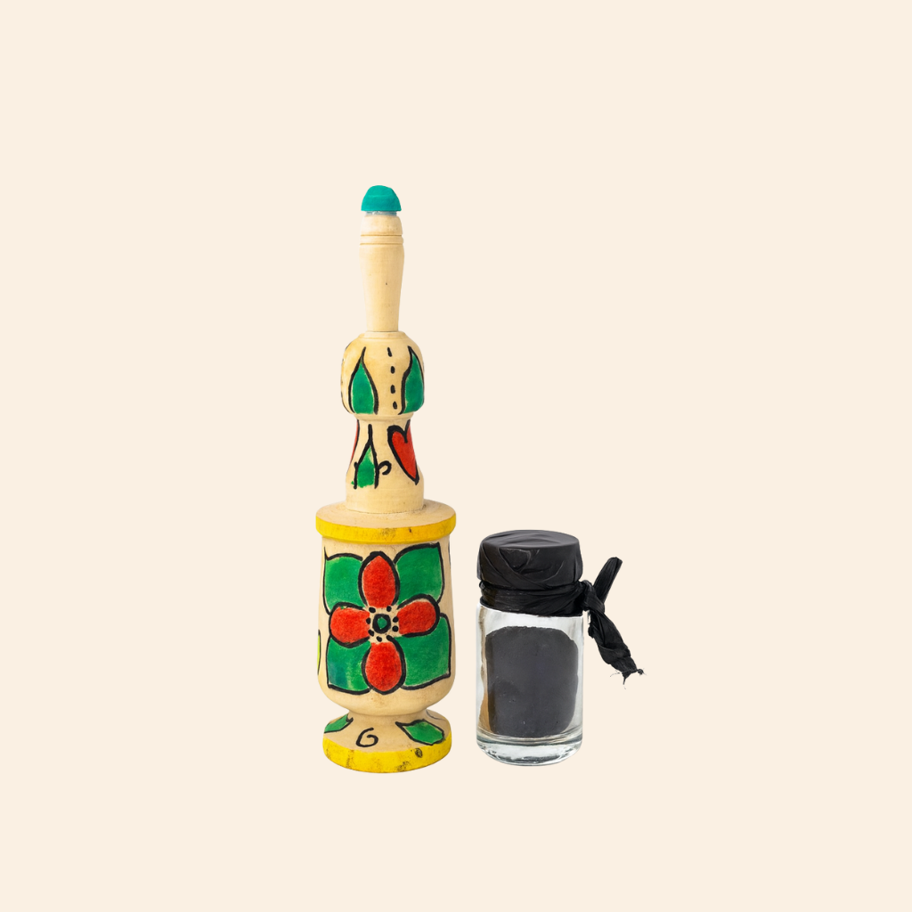 Le khôl marocain est une poudre noire naturelle appliquée sur les yeux avec un mirwed. Traditionnellement utilisé pour sublimer le regard, il est aussi réputé pour ses bienfaits protecteurs contre la poussière et le soleil. Vendu à l'unité